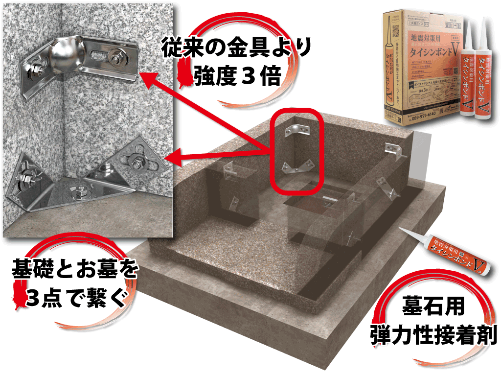 地震対策として、石と石の接合部分に特許を取得しております「特殊金具」と「墓石用接着剤」を使用しております。