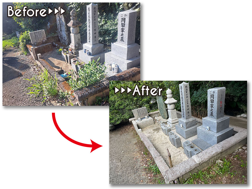 当店では、墓石のクリーニングから目地の補修、敷地内の整地・草取りまでを一貫して行い、清潔で整った墓所へと再生いたします。