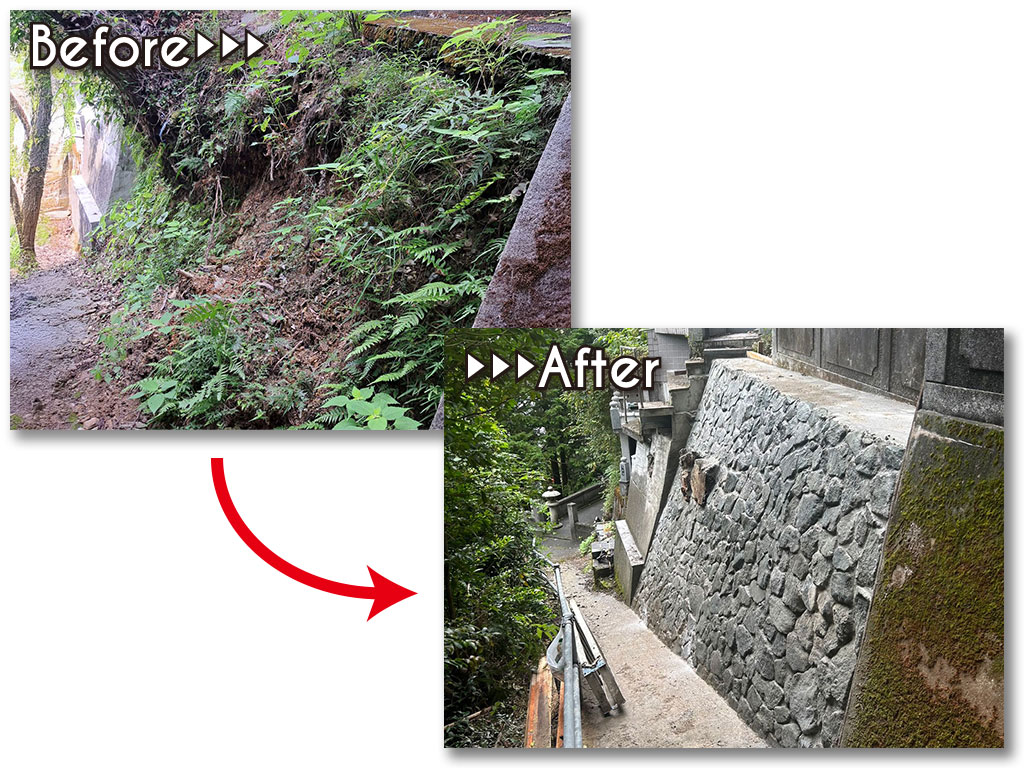 お墓だけではなく、墓所を囲む石垣や外構の修繕・補強工事も承っております。